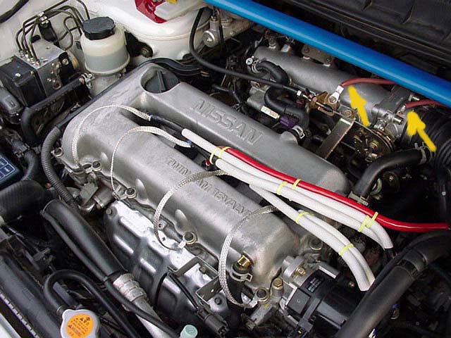 スロットルボデイーとチャンバー部のアーシング位置です。黄色矢印ね。ちなみにここの配線材はバッテリーあがり用ブースターコード(100A)をホームセンターで安く買って使用しました。