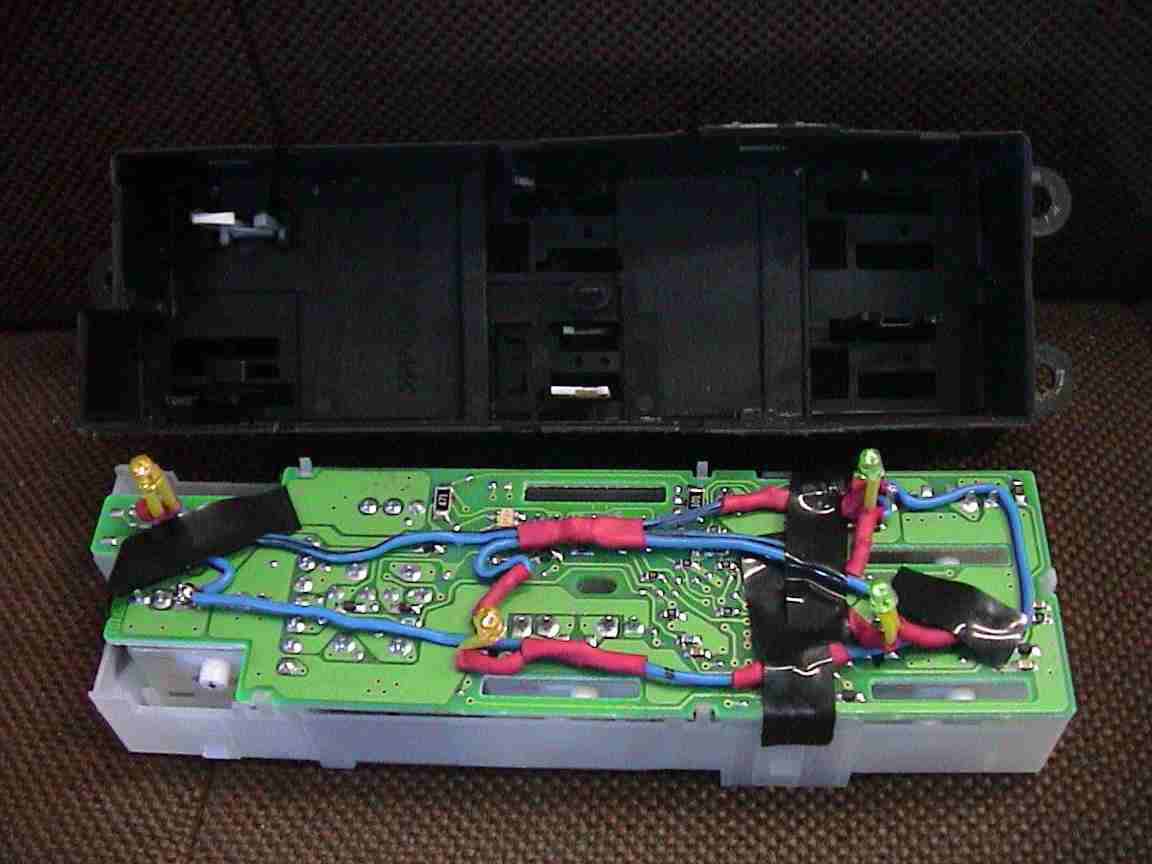 写真(基盤上)PWロックスイッチ右上に4つのLEDを集合させて半田止め、