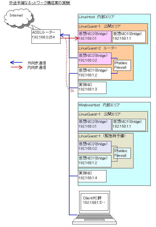VMwareーServerを使って、また変則的なことを考えてしまいました。 ホストOSとゲストOS間が仮想ブリッジ接続となっていることを 利用し、そこでセグメントを分けてしまおうという考えです。 そうすれば多少はリスク低減の方向かと。。 以下、少し実験をしたのでその結果も踏まえての 記事です。