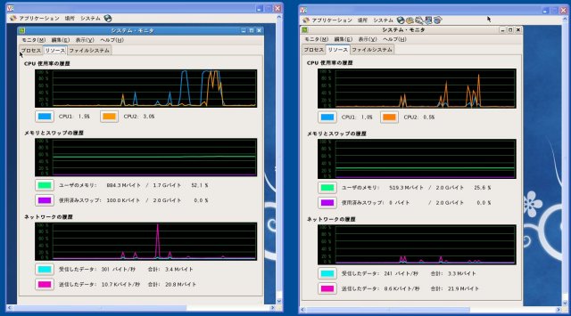 以下は、なーお'nWEBの新着情報にアクセスした時の、VNC経由でのGNOMEシステムモニタグラフ。 左がx86_64、右がi386。 明らかに、64bitの方に異常な高負荷がかかってます。 同じデータを参照しているのに。 :-o