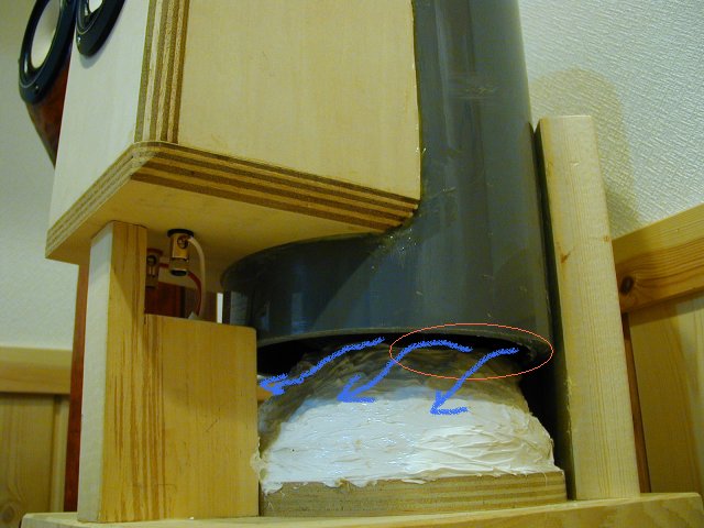 これはL側のスピーカーのスパイラル出口を撮影したものでして、下から見上げたとき螺旋音道はCCW(左回転)で降りてくる構造です。 丁度ユニットの 180度裏側辺りが螺旋仕切りの末端でして(画像の○印の奥)、そこからディフューザーで導くように空気の流れを作るものです。