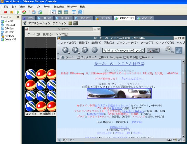 そういうわけで、VineLinux4.0の正式リリースまでの間にVM-ware上で環境整備を予察しておき、4.0リリースと同時に、会社の公開サー バーを乗り換えようかと画策しています。 このように事前に挙動を確かめたいような使い方には、VMWareは本当に便利ですね。 そしてrpmとapt が両方使えるVineLinuxは当分の間、私の友です。