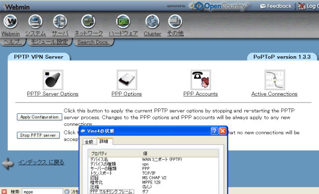 これはVineLinux4.0β2のPPTPサーバーに、WinXPから接続したところです。 このようにカーネルにMPPEが既に構成されているという メリットは、 カーネルのセキュリティーアップデートが行われたときに再構築なしに、すぐにアップデートを行えるということです。