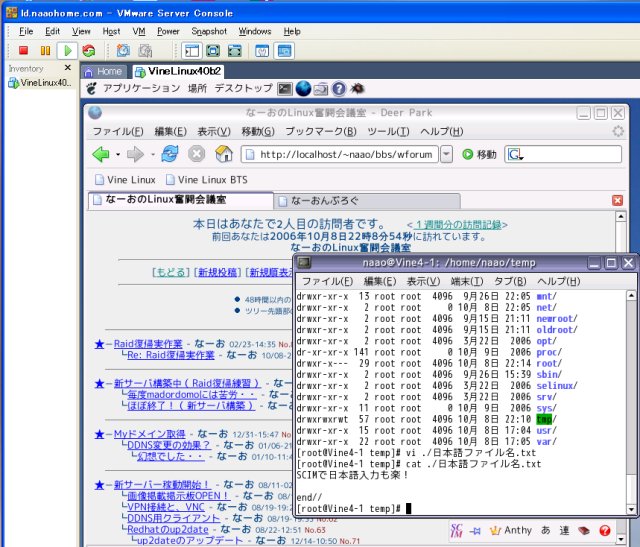 これはそのVine3.1上でVine4.0β2を、別の(windows)PCのコンソールからリモートで設定・稼動させているところです。 早速cgi の掲示板も動かしてみました。 余談ですが、日本語入力が最初から「SCIM」が乗っており、「半角/全角」キーで日本語入力に切り替わったり、 Functionキーでカタカナや半角にできたり、windowsIMEに操作が近く、使いやすくなっています。