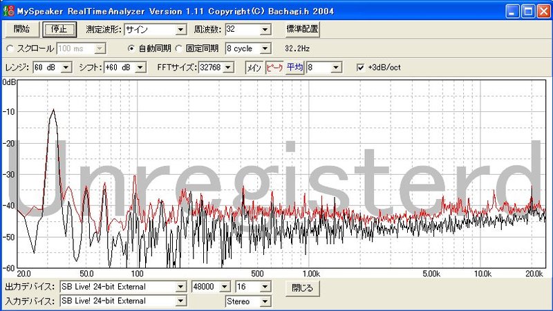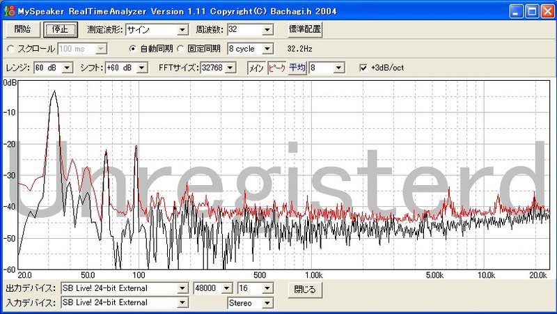 32Hz再生時の高調波歪がどんな感じなのかを、MySpeakerのリアルタイムアナライザで測ってみました。(距離1m) 大体常用の音量程度ですが、2枚目のグラフは最初より音量を+6dbほど上げたものです。