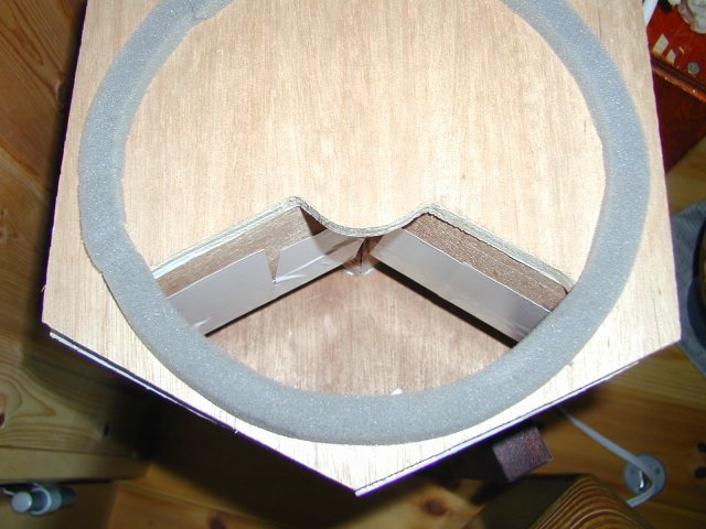 そこで、当初より予定していたフィンの延長を(ガムテープで)行ってみました。 これで、およそ三角形の面積=フィンスロート面積となります。 こうする とやはりボンつきは完全に抑えられ、バスレフ共振が下に伸びてきました。 ただ、少々音に元気がなくなった感もあります。