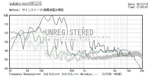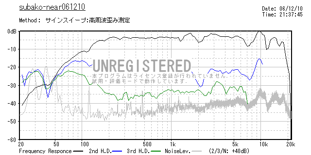 また、音量6db上げただけで、3次高調波歪は10db上昇しています。 やはり8cmクラスにこの領域は苦しいということでしょうか。 高域が 延びたユニットなので、下が伸びることで今までよりもバランスが良くなり、スケール感もかなり上がって、軽い低音で尾を引かないので長時間聴いていても気 分が悪くなるようなことはないのですが、歪感はありますね、歪率10%オーバーですから。