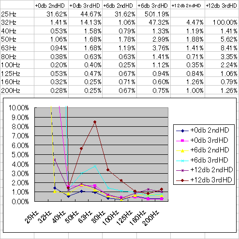 061224追記: 測定結果の基音、2nd、3rdの各ピークを読み取り、歪み率(%)計算した結果のグラフプロットです。 :追記終わり