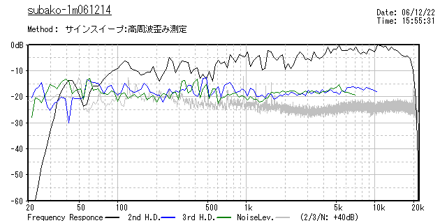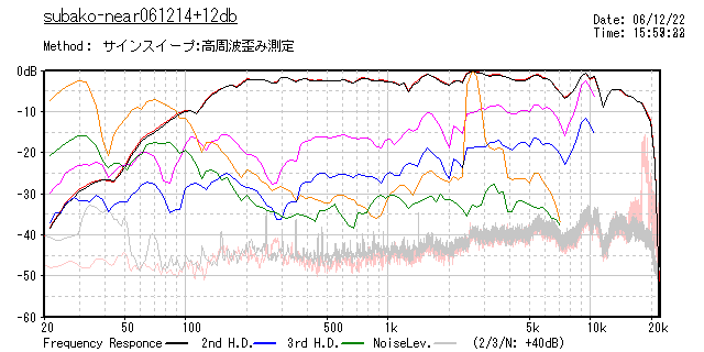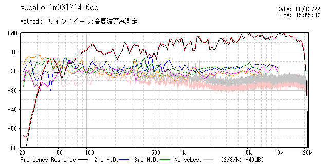 次に高調波歪の測定。 常用音圧レベルと、+6db、+12dbを測定しました。 例によって2ndHD,3rdHD,Noiseは+40dbプロットです。