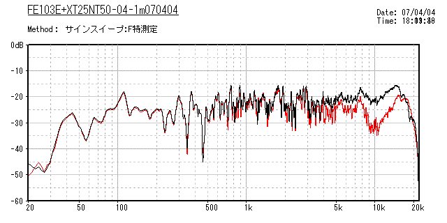 ツイーター接続を反転させた場合()は明らかにレベルが落ちて、10KHzの谷が深くなってます。