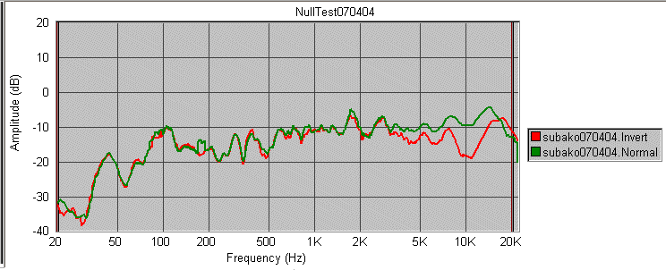 ツイーター接続を反転させた場合(赤)は明らかにレベルが落ちて、10KHzの谷が深くなってます。