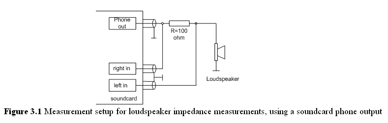 まず、測定には高出力アンプは不要です。 サウンドカードの「Phone」出力があればこれを使えます。 アンプ出力の減衰回路が不要ですし、初心者には安心です。 接続は右図のようになっています。 (今度はL/Rは図のとおりにしました。)