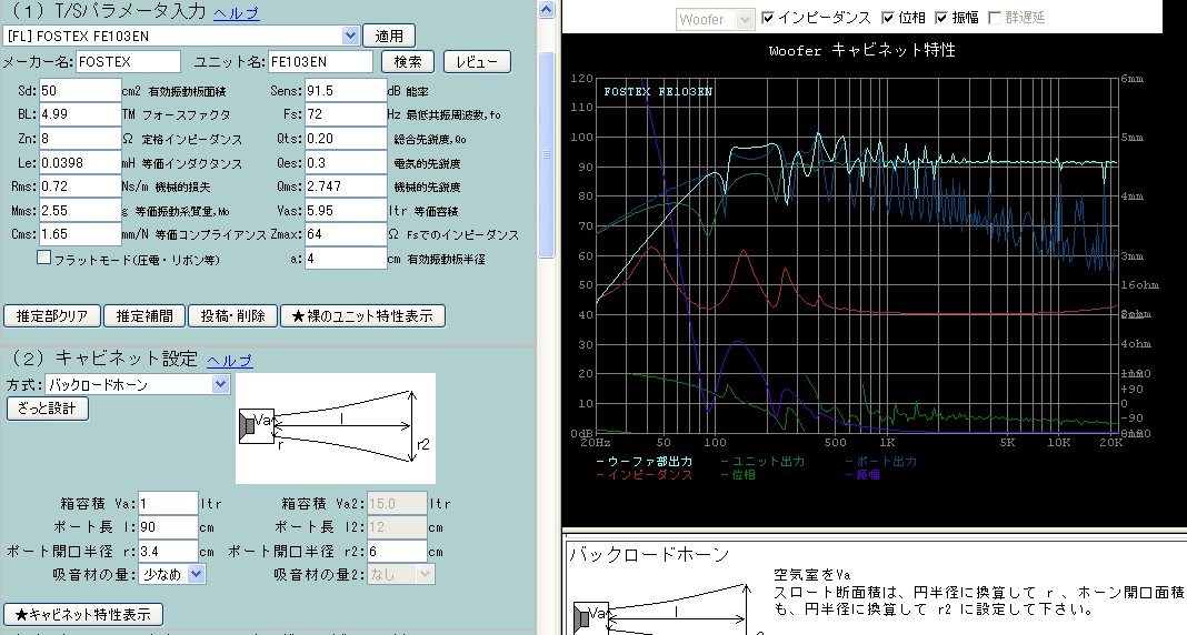 これは、例の「自作スピーカー設計プログラム」の「アプレット版」です。 いろんな形式のエンクロージャの特性予想ができますよ?。