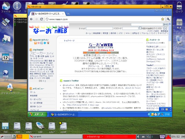 独自のディストリビューション体系なので使いこもうとすると不便な場面も多いのですが、 X22などpentium3クラス+メモリ386MBのPCでも、それほどストレスなく動きます。 上の画像のように、rdesktopも全く問題なしです。 :-)