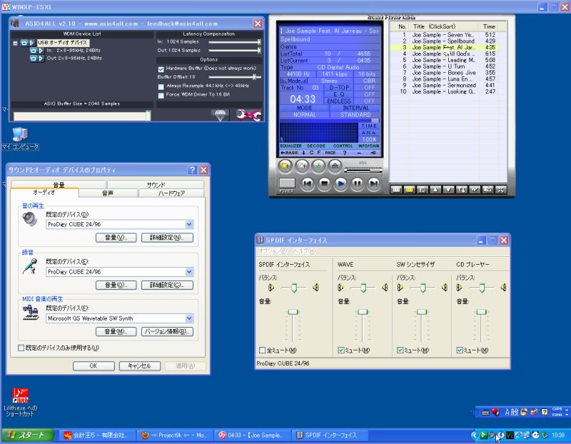 経路: ESXi上のWindowsXP --> Sound Player Lilith --> Asio4All --> USBパススルー --> Prodigy Cube (USBサウンドデバイス 光アウト) --> (Accuphase)DC61 ASIO4ALLを使うと、Windowsミキサをパスすることで音質が向上するのですが、バッファー設定をほぼMAXにしないと途中で飛びます。