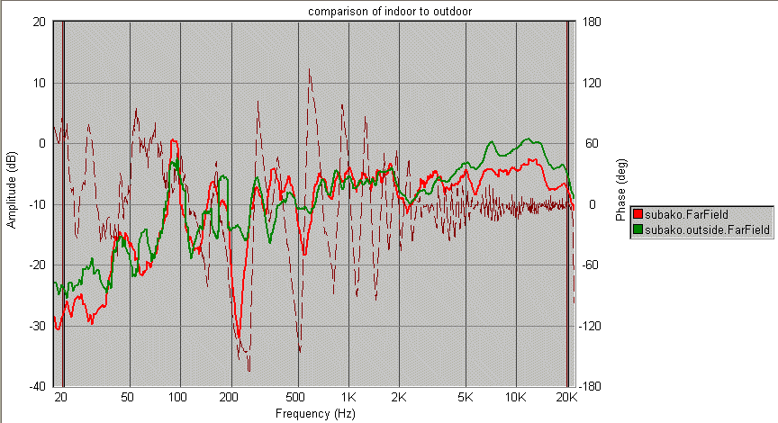 中域以下は室内のグラフと似ています。 高域は室内の測定で軸上からずれていたのか、壁の反射で減衰していたのか。。 そして200Hzのディップが消えています。 どうやら部屋の影響だったようです。