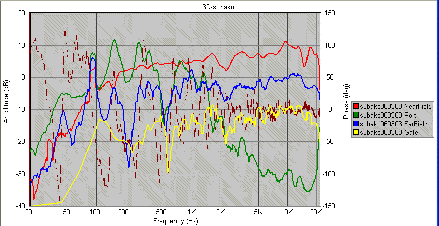 そ れと、黄色の線のGate測定(間接音をカット)ですが、30Hzまで測定できるハズが、実際は100Hz以下が急降下。 ・・ これって位相が遅れすぎ て33msのゲートでちょん切られちゃってるってことですよね、たぶん。  イヤー、SpeakerWorkshop恐るべし! 「バックロード的なス ピードある低音」と思ってきたことの誤りを、気になった次の日に見事に指摘されてしまった感が有ります。  なんだ、40Hz付近のヘルムホルツ共振と変 わらないじゃんって。(涙) これは相当凹みます。。 <でも↓でswanも同様でした、少し安心。>