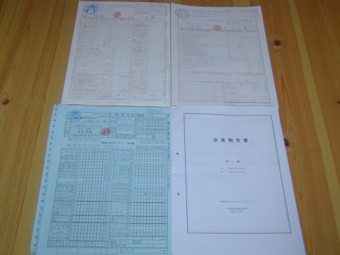 手前左から 法人税確定申告書、決算書、県民税確定申告書、市民税 確定申告書。この他に別紙や添付書類などが20数枚ありました。 市民税の申告書が、市町村合併(3月27日より香取郡山田町 -> 香取市に)の関係で送付が 遅れていたようで、払いに行ったその場で書きました。