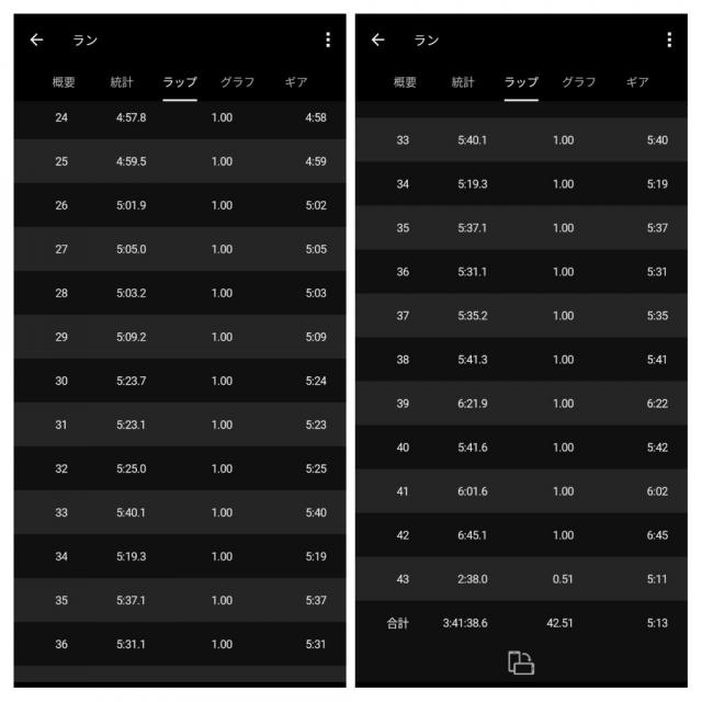 その後は、いつものようにサブフォーペースを維持する方法に変更。千波湖周回は毎回メンタルがやられます。でもどうにかタータンのクッションに助けられて、超絶失速はせずに千波湖を後にしました。37km付近でモルテンジェル2つめ投入。