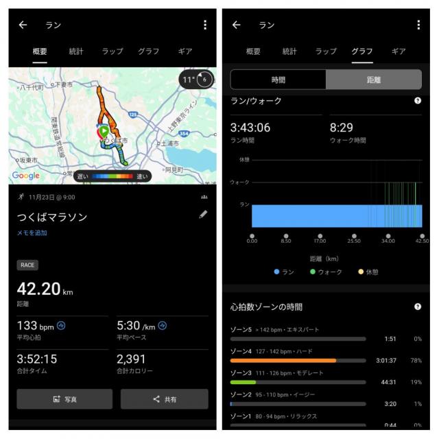 走意識、フォームに関しては、つくばマラソン10日前くらいに気づいた骨盤回旋を地面が後ろに流れる速度を変換利用する意識が、練習時間が短く自分のものになっていませんでした。その結果、骨盤にエネルギーを利用する際に太腿にかかるブレーキ方向の力が前腿の疲労に繋がっていたと考えています。