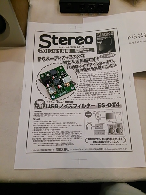 今月号は、11月のstereoスピーカーコンテストの総評と、エミライ社とコラボした付録のUSB接続電源フィルター「ES-OT4」。