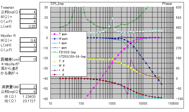 一方、ツイーター(DAYTON)ND20FA-6とのつながりですが、現在は6db/Octで、ツイーター側にコンデンサ3.2μFのみ、 フルレン ジ側に コイル0.68mHのみで、逆相で綺麗に繋がっています。 クロスの7Khz付近が少々高めですがツイーターを2dbくらい落とすか、 FE103E側のコイルを少し大きくすればよいかもしれません。
