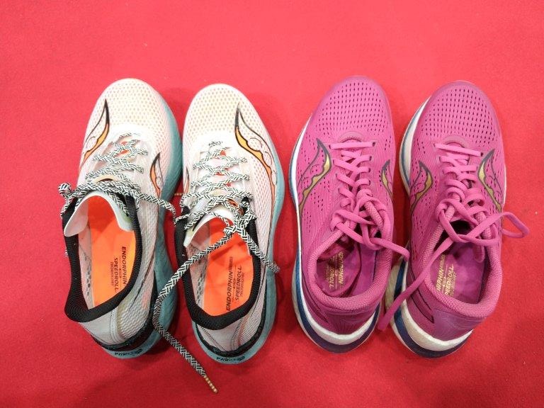 シューズは、先日メルカリで購入し盛岡で受け取った中古の Endorphin Speed 3。EXPOでsauconyブースがあったので、お願いしてEndorphin Pro 3 を試し履き。持参したSpeed 3 との比較では、プレートはやっぱり硬く、Speed3よりクッションは少なくなっている印象。とても私の手に負える代物ではありません。 藤原商会さんが「じゃじゃ馬」というほどつま先のロッカー構造がキツく、初代ズームフライのように「カクっ」とならないようにうまく使いこなすのは難しい部類かと思いました。