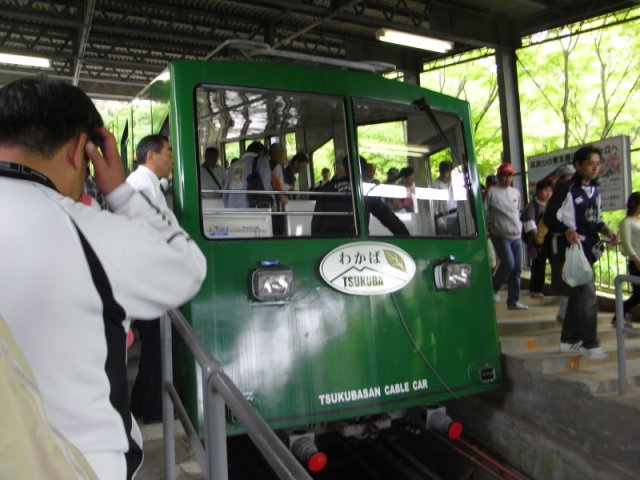 筑波山神社まで徒歩10分くらい。神社境内からケーブルカー乗り場までの階段は、案外しんどかった。 ママは子供たちに手をひかれ・・ 乗り場の「宮脇駅」で、おきまりの1枚。