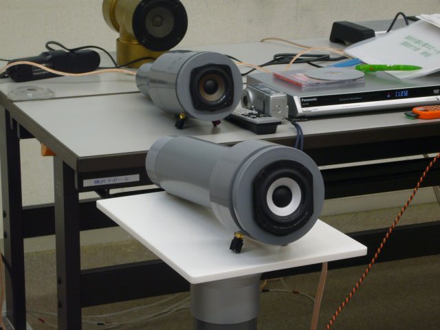 胴 体の2/3ほど、スパイラルが組み込まれているとのこと。 その胴体の外側にキャプタイヤケーブルを巻いて鳴き止めにしてまして、結構効果がありそうな感 じでした。 FE108EΣの方は、低音も十分に出ていて迫力がありました。 タンデムの方は、前方ユニットと後方ユニットが逆相なので、各ユニット前面 同士/背面同士の音が打ち消しあって中低域以下が出ていないように思いました。 同相で内容積を増やすのはどうでしょ?