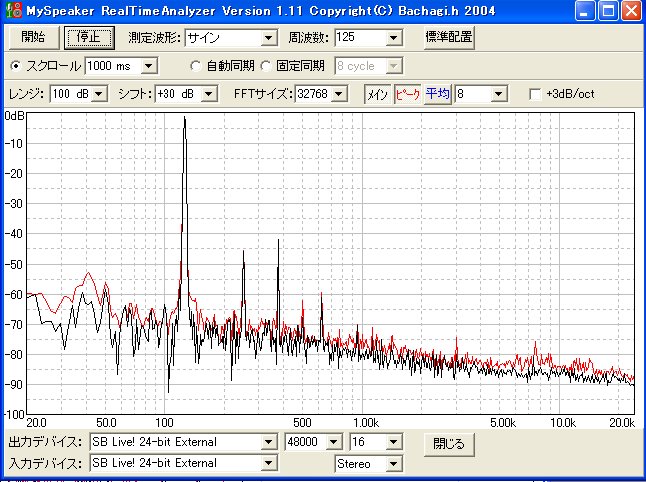 また、音量6db上げただけで、3次高調波歪は10db上昇しています。 やはり8cmクラスにこの領域は苦しいということでしょうか。 高域が 延びたユニットなので、下が伸びることで今までよりもバランスが良くなり、スケール感もかなり上がって、軽い低音で尾を引かないので長時間聴いていても気 分が悪くなるようなことはないのですが、歪感はありますね、歪率10%オーバーですから。