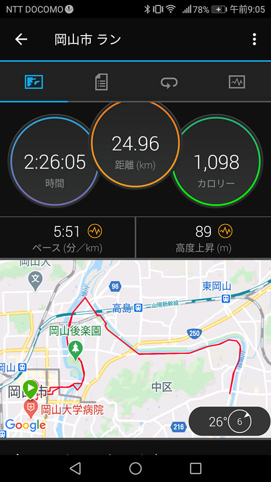 - 土日とも現地休になったので、2日連続で旭川・百間側ランニングコース を走りました。初日は、往路ゴールからホテルに向かってワンウエイで20Km。使用シューズはズームフライFK.