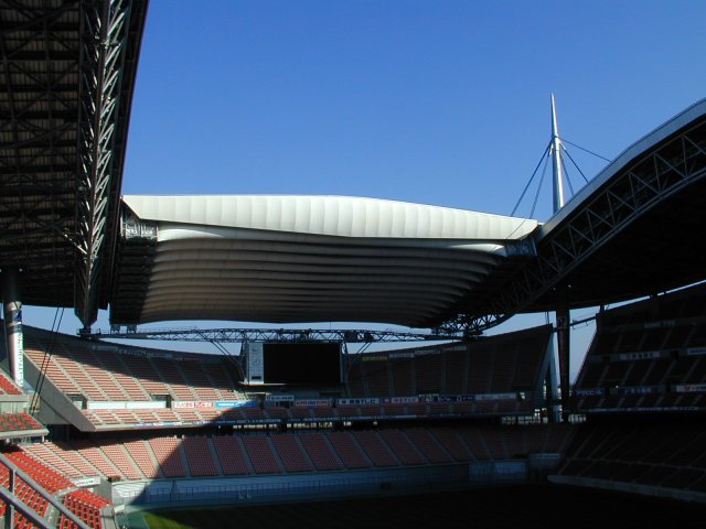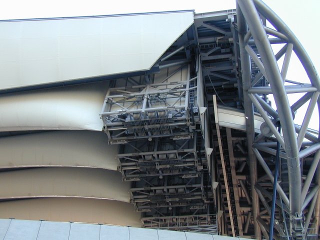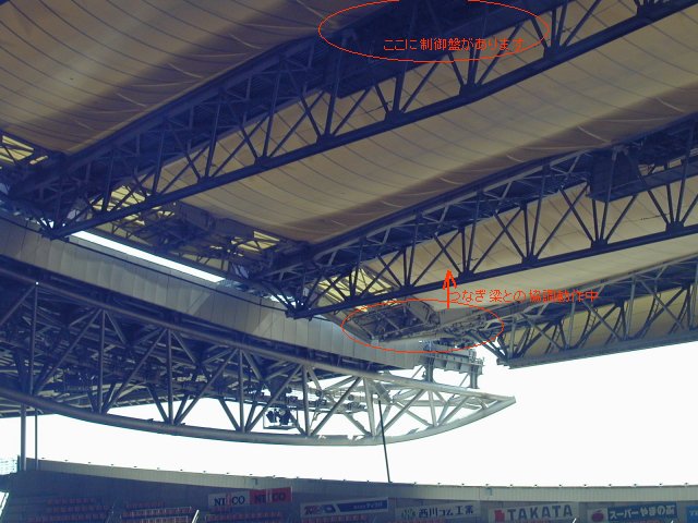 閉め始めはカーテンを広げるように伸びてゆきますが、屋根の開閉動作の最大の見せ場は、最後に待っているつなぎ梁との速度協調運転です。 →は北側の道 路から見上げた写真ですが、これに写るワイヤーを一定速度で引っ張ることで、つなぎ梁自身が持ち上がります。 (正直言ってこの下は歩きたくありません。 何か落ちてきそうな錯覚が襲ってきます・・)