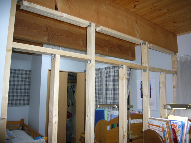 今日は、晴天で暑いながらも風があり、室内のDIYに好適と思い立ち、 かねてからの懸案で材料も下地材まで購入済みの、子供部屋の間仕切り工事に着手しました。
