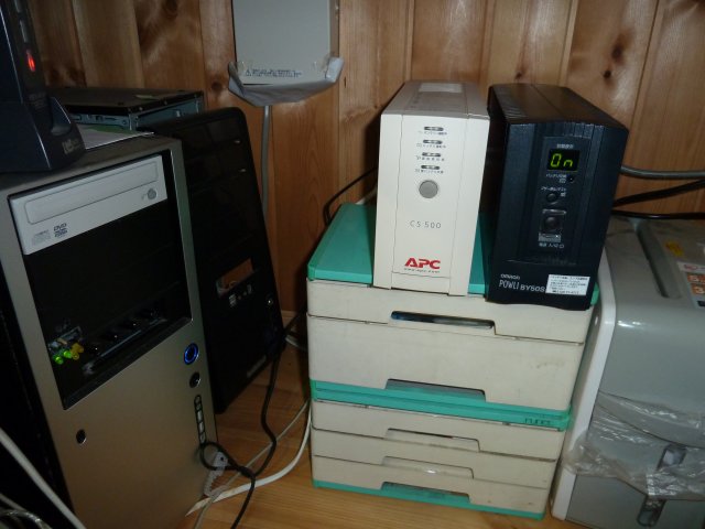 左側の白いのが旧UPS(APC-CS500)、右側の黒いのが新UPS(OMRON-BY50S)