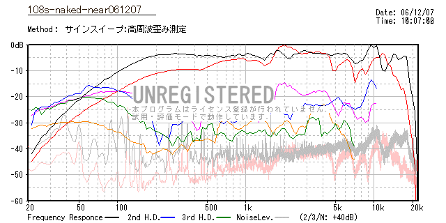 NearFieldでの歪測定グラフ。 案の定、バックロードによる70hz付近の歪減少効果が減ってしまっている。 要設計変更。