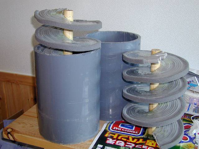 200mm 径スパイラルは、6mm 厚のキャプタイヤケーブルを13周巻き上げています。これだけ大きいと、最外周までキャプタイヤで固めてしまうと固くて挿入できません。今回は、最後の1 周(厚みにして2mm くらい)分は「すきまテープ」スポンジを使い、多量のエポキシ接着剤で塩ビ管に接着しました。