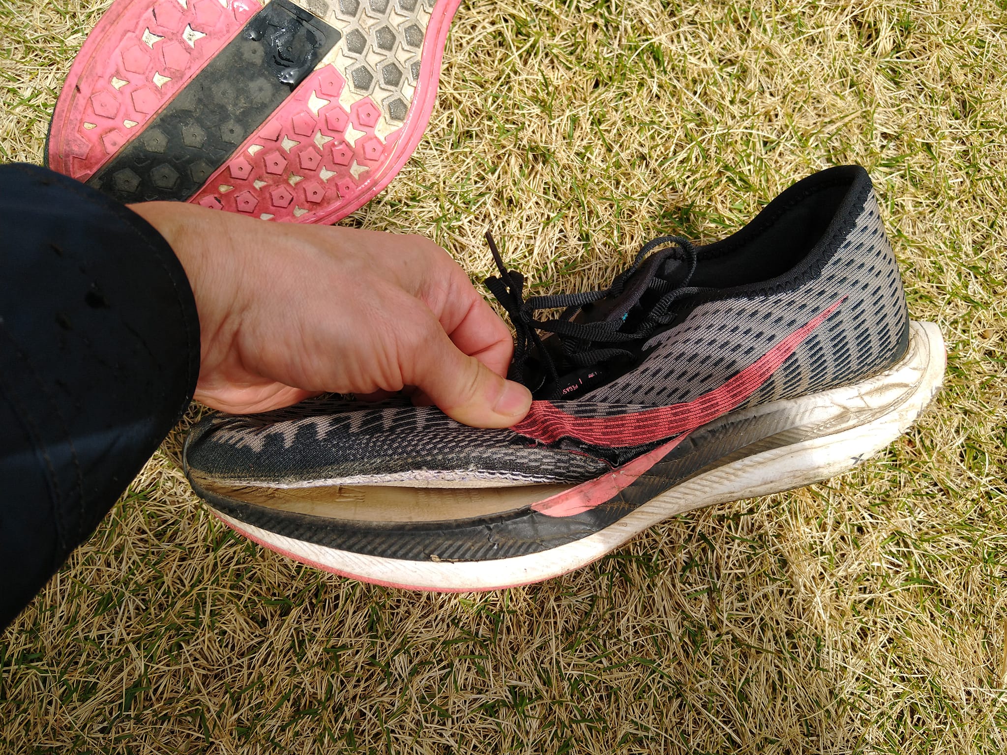 以前よりトレーニングには(ナイキ)ズームペガサスターボ2を愛用し、1年半フルに使って2,000km以上走りまして、だいぶすり減りズームXの反発もヘタってすっかり落ちてしまいました。