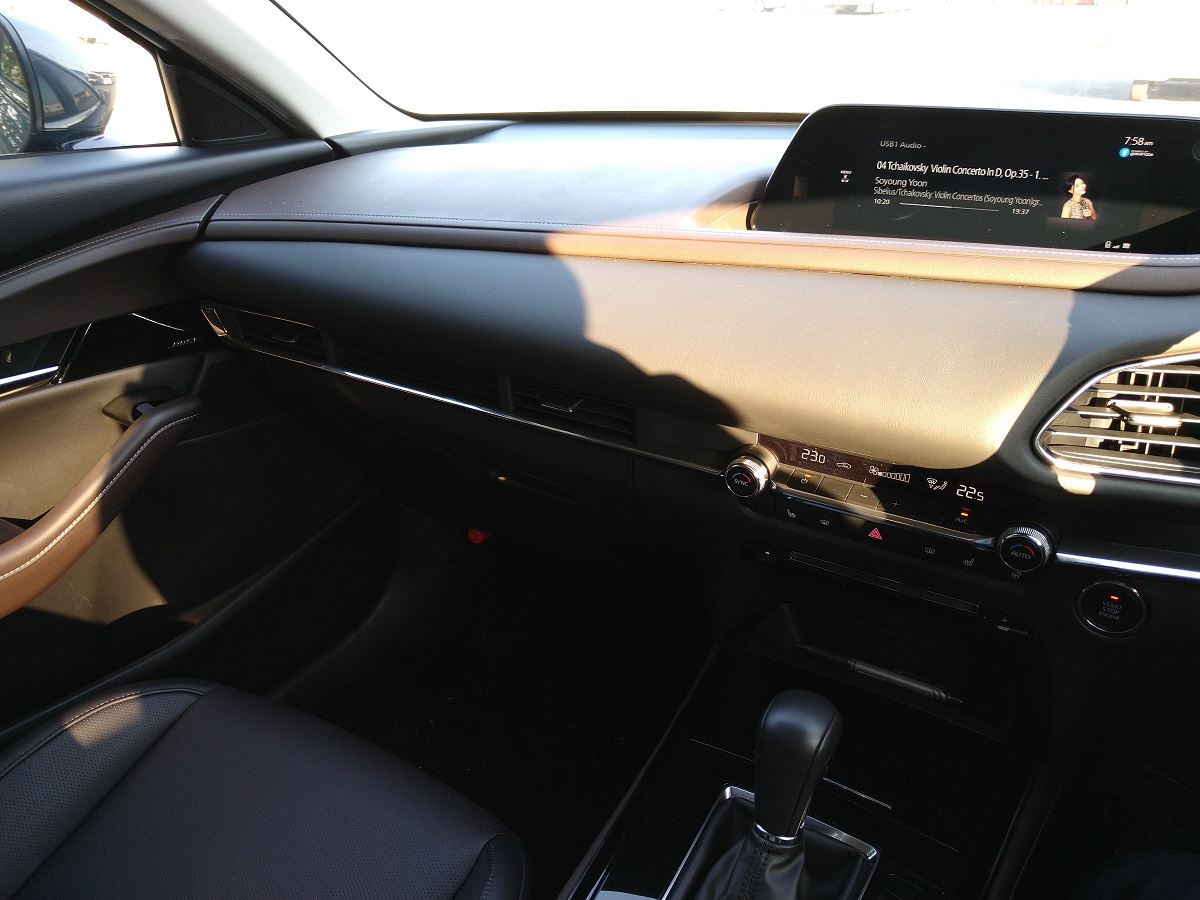 少しだけ残念なのが、ステアリング中立付近の直進安定性と微舵角の応答性。 プレマシー(ラフェスタHS)は電動オイルポンプ式油圧パワステだったため、フリクション感がほとんどなく、どっしりした直進安定性をもちながらも、中立付近の微舵角も微妙な力加減でコントロールが可能な秀逸なステアリングフィールを持っていたのですが、CX-30は微妙なフリクションを感じるのと、力加減ではなく微舵角を与える必要があること、これは電動パワステが持つ本質的な弱点なのかもしれません。 - ディーゼルターボエンンジンの重さの影響なのか、ステアリングの切り込み後のノーズの反応に遅れがあります。ゆったり乗る分には全く問題なくスムーズな反応でも、ワインディングを飛ばし気味に走る楽しさは減退気味です。もしかすると、スロー気味に振ってあるステアリングギヤレシオの影響もあるかもしれません。意識的にクイック気味にはじめに深めに切り込むと良さそうに感じます。そしてワインディングをそこそこのスピードで走ってもタイヤを鳴かせることすらできず、限界が低いわけではないので安定感のある走りは十分にできるし、何よりマツダのステアリングと、GVC+(Gベクタリングコントロールプラス)の働きでコーナー進入後の旋回感はスムーズこの上ないため、トータルでは安心感のある運動性能と思います。時にはシフトをマニュアルモードに入れて3rdギヤで4000rpm付近を保ちつつワインディングを駆け抜ける際には、アクセルレスポンスも良くなってエンジンブレーキも良く効くので、思いのほか楽しめる足だと思います。