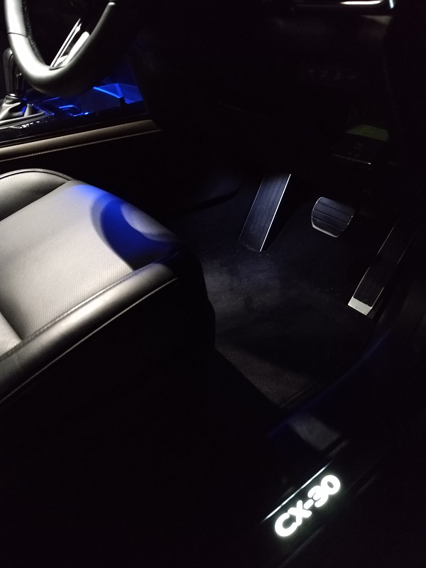 ダッシュボードとフロントドアのソフトパッド、ステッチ、クローム部品の形と使い方をはじめ、ドライバーが運転に集中できるシンメトリカルなインパネ周りのデザイン、助手席側の流麗な造形もとてもよく纏まっていると思います。 また、各スイッチの操作時の質感が統一されていて、クリック感がしっかりありながら安っぽくない感触も地味ながらポイントが高いです。 - 弱点としては、センターコンソール前方のカップホルダー付近に照明が無く、WEB情報を頼りに市販の車載用USBコネクタ差し照明を購入し取り付けています。 ACC電源断後6分程度、マツコネ電源と同様に点灯状態を継続し、その後消灯します。 オプションとして装備されていた、PREMIUM SELECTIONの3点セット、フットランプ、スポーツペダルセット、イルミネーションスカッフプレート、中々良いですが、まあペダルセットは市販品のほうがずっとコスパが良いのでオマケみたいなものと認識してます。