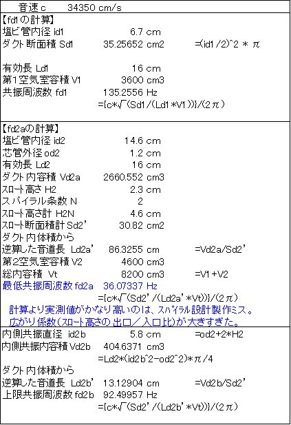 音は、スピード感はあまり無いが、40?100Hz付近の低域の量感が十分に厚く、落ち着いた音になりました。 ある意味、ダブルバスレフ甘い低域なのだが、スパイラルダクトのおかげで低域輻射周波数域が広い(ロードのかかる範囲が広い)ので、小口径の割りに歪み感が少ない、量感はかなりあって落ち着いて聴ける低域です。