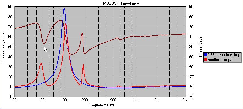 FE88ES-Rの裸(バッフル無し)の特性との比較。ダブルバスレフとしての動作と、スパイラルの広帯域共振の感じが出てますかね。