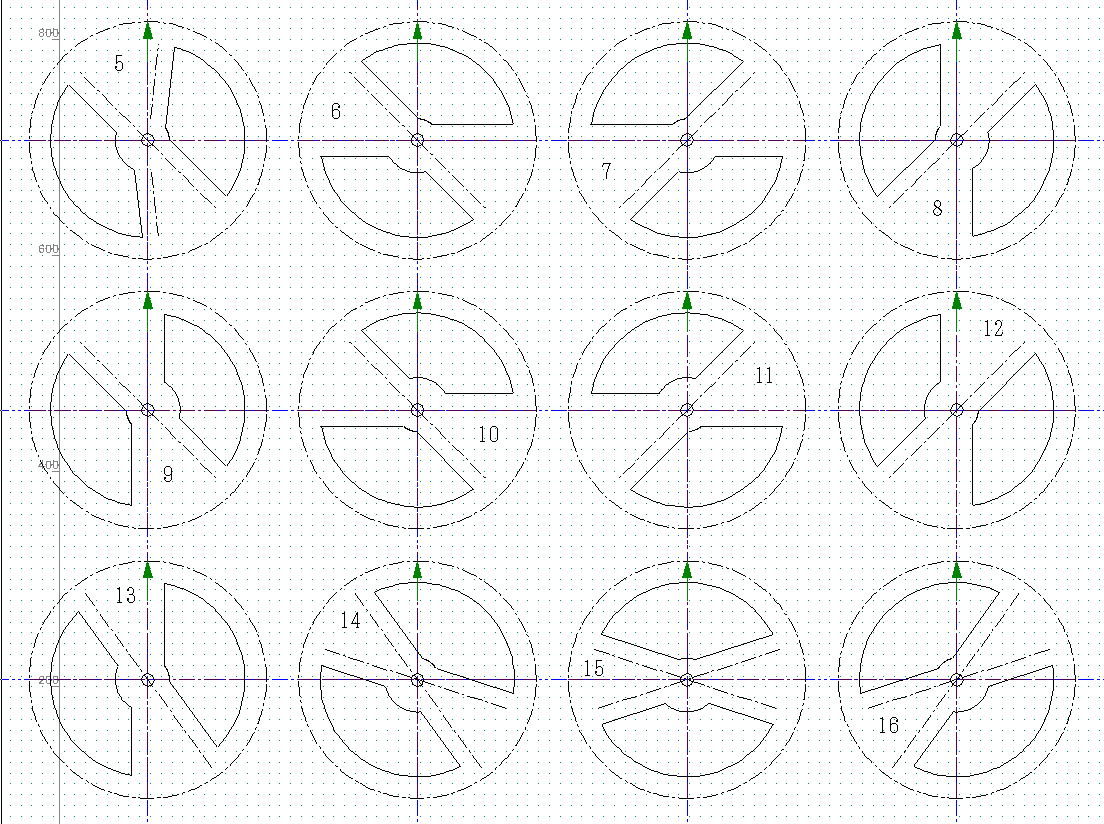 スパイラル各断面disk5~16.gif disk16~24.gif 2条スパイラルですので、長手方向のベクトルが大めなので、各ディスクの斜め研削は省略して板厚分45°カットのみとします。