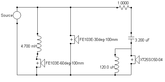 改善のために、60°設置の(一番下の)FE103Eに4~10mHのコイルを入れざるを得ない状況。 テストの結果1本スルーのままなので音質劣化は最小限。 低域の位相が90°変わるので効率が落ちますが大丈夫なようです。 ついでに、FE107Eに変更しようと思います。 低域のレベル上昇のためにはMの大きなウーハーに変更すべきですが、200Hz付近の音質のつながりを思うとそれはしたくない・・