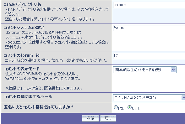 1. コメントシステムの設定 : d3forumのコメント統合機能を使用する場合はd3forumのhtml側ディレクトリ名を指定します。xoopsコメントを使用する場合やコメント機能を無効にする場合は空欄です。