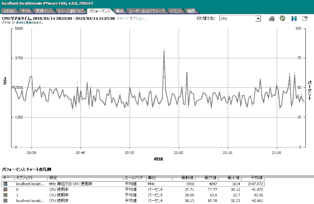 アクセス数がそれなりにある、日曜日の午後9時頃のCPU負荷グラフを貼っておきます。 平均40~45%程度と読めます。 一つの仮想ホストで負荷がかかっても、他の仮想ホストも結構粘れる状況を維持できています。