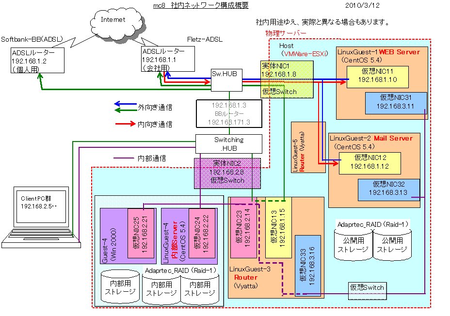 - 社内ネットワークと公開サーバーを置くネットワークとの完全分離は、会社規模の関係もありできませんが、フリーの仮想ブロードバンドルーター「Vyatta」を配置することにより、同一マシン上の仮想ホスト間でセグメントを分離し、通信の遮断をしています。