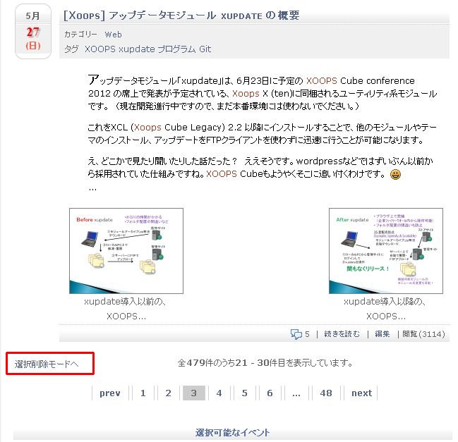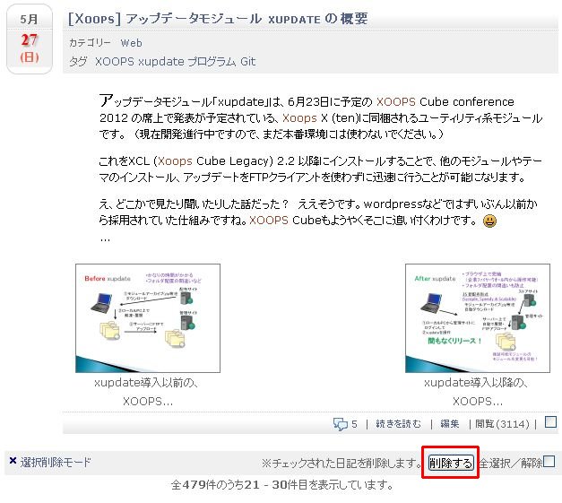 このモードの状態でタグやカテゴリー、年月日での絞り込み、ページ送りが可能。 選択削除モードを抜けたいときは、「選択削除モード」をクリックすると通常モードに戻ります。 - リストの下部に、「削除する」ボタンが出るので、クリック。