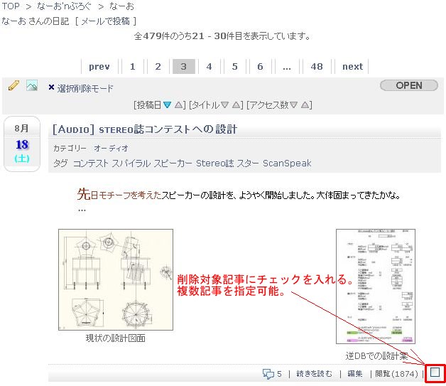 - ログオンして自分のindexリストページにアクセスし、スクロールしてゆくと一番下の左側に、「選択削除モードへ」リンクが現れます。管理者であれば他のメンバーのリストを表示の際にも出てきて操作可能です。
