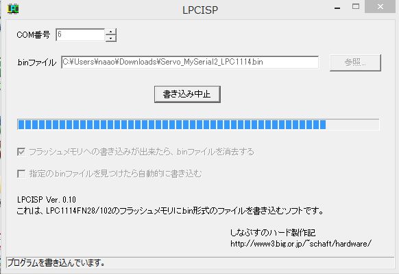 LPC1114限定で「LPCISP」というソフトを公開しておられます。USB/serialコンバーター経由で一発書き込み、即座にリセットが働くので、楽ちんです。