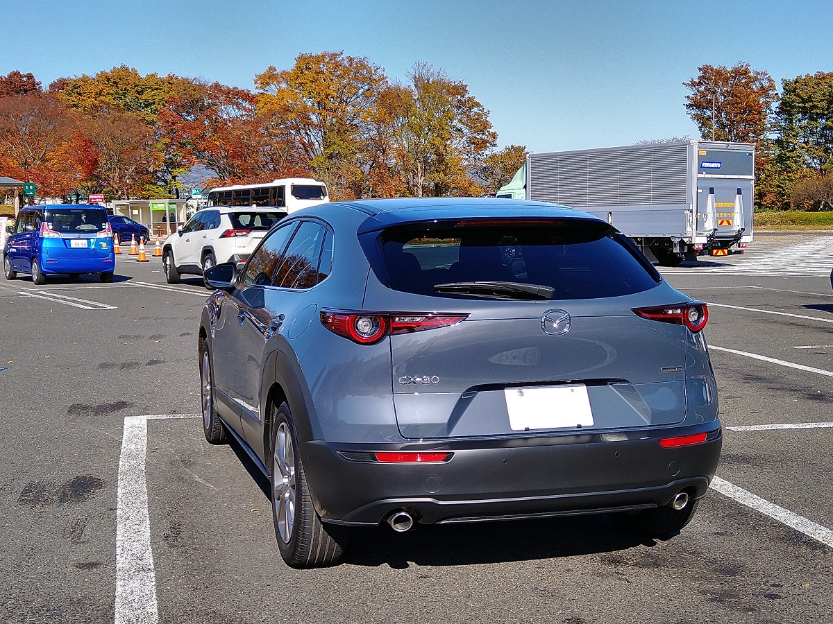 • 私のお気に入りは、リヤ斜め後ろからの眺めですね。 元々、ごちゃごちゃしたデザインを嫌いクリーンでシンプル路線が好みですが、CX-30のセクシーにくびれたお尻は魅惑的です。思えば初代ホンダクイントインテグラや日産リバティのリヤ周りはスッキリしていて好きでした。